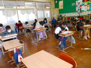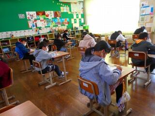 小学5年生は、みやざき小中学校学習状況調査を実施しました。国語と算数の学力テストです。4月に行われる全国学力・学習状況調査に向けて、5年生の学習状況を把握し、課題を見つけて学力アップを図ることがねらいの一つです。今日のテストは、最初に、国語の聞き取りテストから行いました。子どもたちは、じーっと放送を聞きながらメモを取り、聞き取りが終わると、問題用紙を開き問題に取り組んでいました。とても真剣な姿でした。