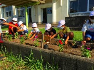 小学部は、朝の活動時間、各学級の花壇に花の苗植えをしました。