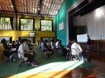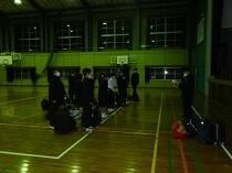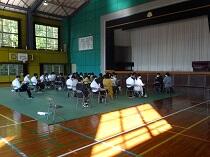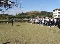 体育館で出発式を行い、学校をでました。多くのことを学んできてください。