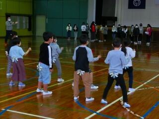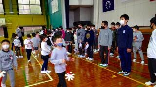 おわかれ集会がありました。雨天のために体育館での実施となり、密を避けるため6年生とそれぞれの学年が交流をしました。1年生は、感謝の言葉とダンス、花のメダルのプレゼントを贈りました。その後、じゃんけん列車をして、6年生と触れあう時間をもちました。竹馬の練習や給食当番でたくさんお世話になった6年生とのお別れの時間をもつことができて、有意義な時間となりました。