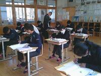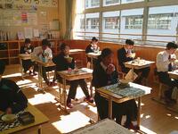 6年生は、「よういスタート!」の題材で同時に入れる水の量が水そうにどのようにたまっていくのかを学習していました。線分図を使い、15等分にしたうちの割合を考え、学習を進めていました。積極的に学ぶ姿勢が良かったです。