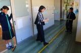 さくら学級の自立の時間を覗いてみました。先生が掃き方がわかりやすいように大きな紙を散らして練習です。