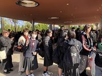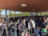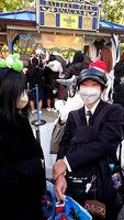 いつも校門で出迎えてくださる校長先生。もちろん、いつものあいさつボランティアの子どもたちもいます.