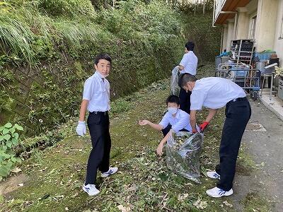 台風14号が通過し、校内に大きな被害はありませんでしたが、緑に囲まれた学校なので校内には木の葉や木の枝が散乱し、かたづけが必要な状況でした。本校の中学生1.2.3年生と小学校5.6年生で朝の時間を活用して奉仕作業を行いました。「自分たちの学校は自分たちできれいにする」という意識をもち、一生懸命に活動してくれました。