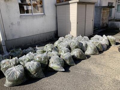 「体育館裏を清掃する3年生」 「子どもたちが集めた木の葉や木の枝」