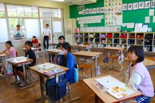 1年生は、算数で色々な形の勉強をしていました。2年生は音楽です。歌ったり、演奏したり、踊ったり
