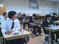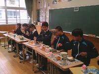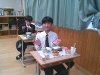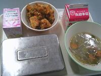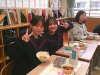今日の給食は、生徒たちに人気のあげたこやき、五目スープ、お祝いデザート(ケーキ)でした外はカリッと中はふんわりとしたあげたこやきに、野菜や具材のうま味がたっぷりつまった五目スープがよく合い、生徒たちも笑顔で味わっていました