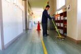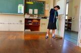 さくら学級の自立の時間を覗いてみました。先生が掃き方がわかりやすいように大きな紙を散らして練習です。