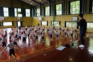 中学部の体育の先生に動的ストレッチのレクチャーを受け、みんな大喜び。