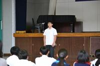 10/25日(金)朝、第48回宮崎県中学校秋季体育大会の推戴式が行われました。 小林校長、佐藤和奏さん(前生徒会長)から激励の言葉があり,各部活動が県大会への意気込みを話しました。学校の代表として,それぞれの舞台での活躍を期待しています。