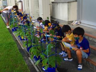 今朝は、始業前に朝顔の観察記録をしていました。絵や文で表す観察記録ですが、まだ、なかなか思うように表現できずにどうやって書こうかと悩む1年生でした。