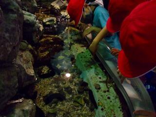 まずは、水族館で海や川の生き物を見て、タッチプールでナマコやヒトデと触れあいました。国語で学習した「もくずがに」を見つけ、「うみのかくれんぼ」の学習を思い出し、大喜びでした。
