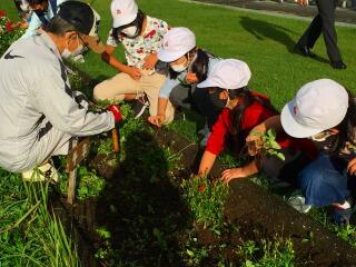 各学級に1名ずつ入り、子どもたちと一緒に草取りをしてく