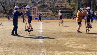 寒風が吹く中、子どもたちが竹馬に乗って一生懸命ににゴールを目指しました。