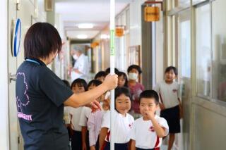 窓から見守る方、後ろからのぞき込む方と様々。おかげで子どもたちのやる気100倍です