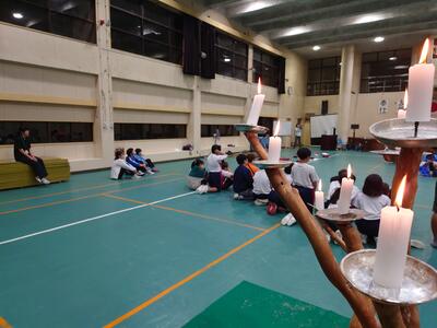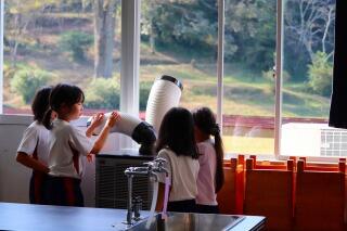 中学部生徒会の集めているペットボトルキャップを『数えます!』と小学部5年生が校長室に。