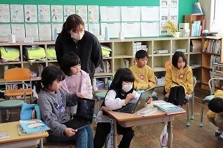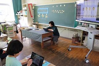 その後の授業参観は、算数の授業でした。小学部1年生は、12コのお菓子を3人で分けたり、4人で分けたりする問題をみんなで解いていきました。その様子を参観していた子どもたち。タブレットで試行錯誤している様子を間近で見る時間は、興味津々。あっと良い間の交流会でした。