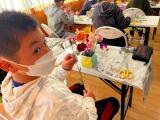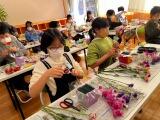 岡田花店から来られた講師の先生の話をよ~く聞きながら、花と悪戦苦闘する子どもたち。