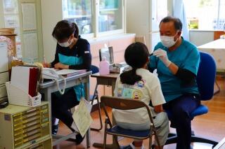 学校歯科医の先生と歯科衛生士の方々をお招きして、歯科健診と歯みがき指導が行われました。