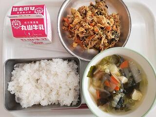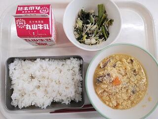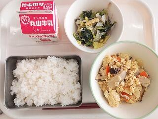 今日は、炒り豆腐をいただきました。椎茸や鶏肉などのうま味も出ており、ごはんに合いました。今が旬の小松菜のごまあえも栄養満点で美味しかったです。