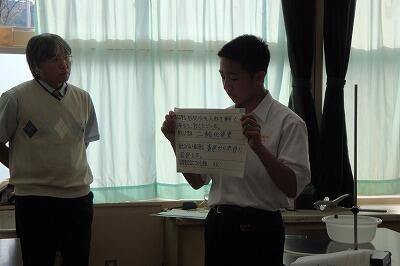 実験結果から加熱によって発生した気体と液体物質名を推定して発表しています。