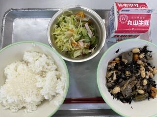 【いかのたきこみごはん 牛乳 かきたま汁 春雨の酢の物】