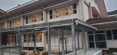 校舎の前の外壁(職員室から保健室前)がなくなりきれいになりました。