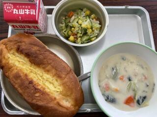 【マヨネーズパン 牛乳 チンゲン菜の米粉のクリームスープ フレンチサラダ】