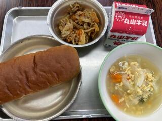 【黒糖パン 牛乳 豚肉のケチャップ炒め オニオンスープ】