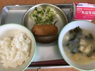 【わかめご飯 牛乳 豚肉のしょうが炒め かきたま汁】
