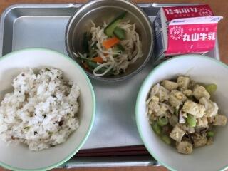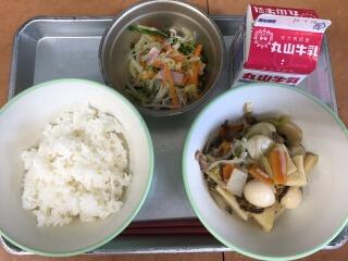 【梅菜めし 牛乳 高野豆腐の卵とじ 千切大根の酢の物】