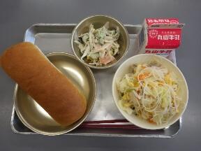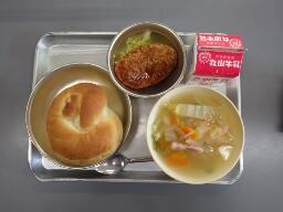コッペパン 鶏肉と大豆のトマト煮 白菜のスープ