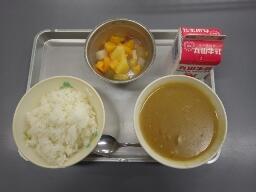 今日は皆さんの大好きな揚げパンです。揚げパンは、パン屋さんから運んでもらったコッペパンを1つ1つ丁寧に給食室で揚げて、きな粉をまぶしています。給食センターの先生方はみなさんのためにおいしい揚げパンを作ろうとがんばっていますので、作って下さった方々に感謝しておいしく食べて下さい。