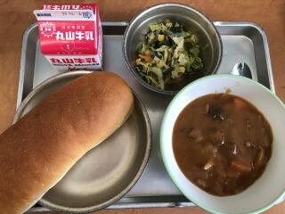 【麦ご飯 牛乳 カレー フレンチサラダ】