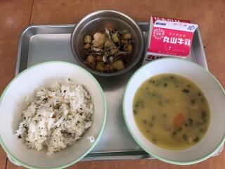 【ゆかりご飯 牛乳 五目豆 青のり和え】