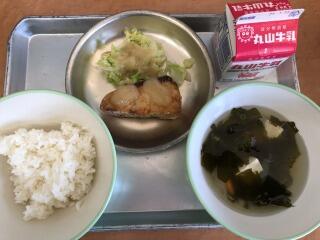 【白ご飯 牛乳 ぶりのおろし煮 ゆでキャベツ 白菜のみそ汁】