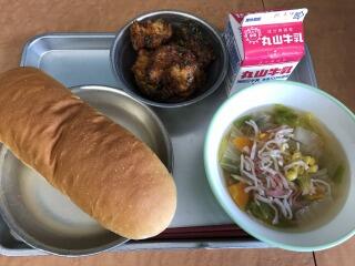 【揚げパン 牛乳 つくねと春雨のスープ アーモンドサラダ】