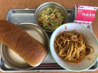 【減量コッペパン 牛乳 ミートソーススパゲティ じゃこの洋風サラダ】