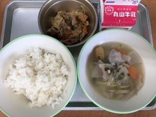 【白ご飯 牛乳 豚肉と厚揚げのみそ炒め 根菜汁】