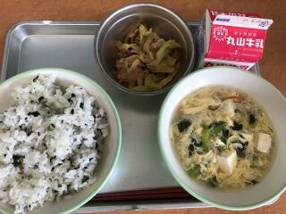 【わかめご飯 牛乳 豚肉のしょうが炒め かきたま汁】