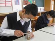 今日は節分。給食には”節分豆”が添えられていました。3年生は、美術の授業で”篆刻(てんこく)”に取り組み、固い石に自分の名前を彫り、印鑑を作っています。印面の名前が仕上がった生徒は、持つところを篆刻等ややすりで削り、自分がイメージした形に仕上げようとしていました。
