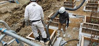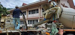新校舎の基礎に生コンを入れる作業がはじまりました。新校舎で生コン車16台、給食棟に8台になるそうです。明日の昼頃で基礎の生コンが終わります。