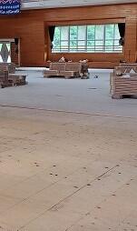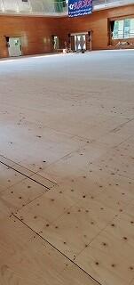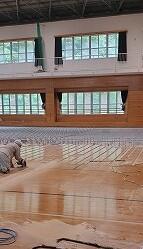 体育館の新しい床が半分搬入されています。その後、研磨等の作業が入り完成にな