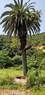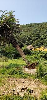 体育館の裏に、新しい校舎と給食棟が新築されます。そのために、桜の木とワシントンパームが伐採されました。