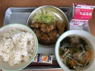 【白ご飯 牛乳 鶏肉の唐揚げ ゆかり和え さつまいもの味噌汁】