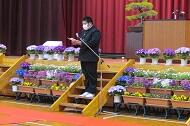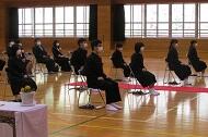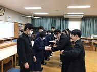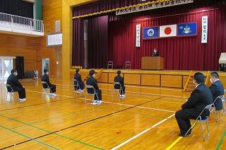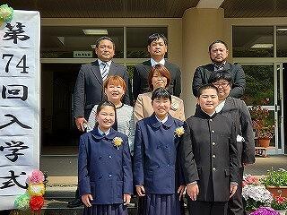 令和2年度第74回入学式が、コロナウイルス感染症拡大防止による対応により簡略しながらの内容で無事に終わることができました。校長式辞の中で、新入生が1人1人が「将来の目標と中学校で頑張ること」を決意表明する場面もあり、2・3年生の先輩方が見守る中、堂々と宣言していました。式後は、学級懇談があり、先輩から教科書贈呈もありました。その後玄関先で集合写真を撮影しました。