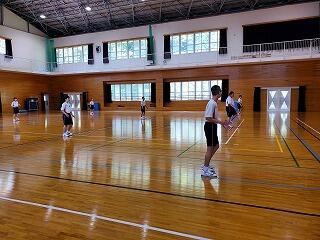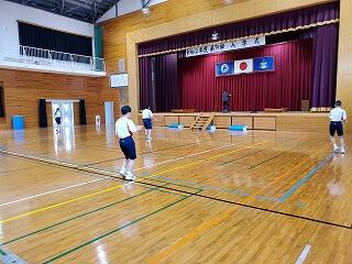 本校では、保健体育の授業を全校体育で実施しています。曲に合わせての運動でした。