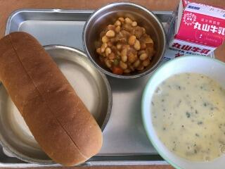 【背割れパン 牛乳 ポークビーンズ コーンポタージュ】