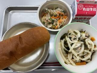 【減量コッペパン 牛乳 わかめうどん 野菜サラダ】