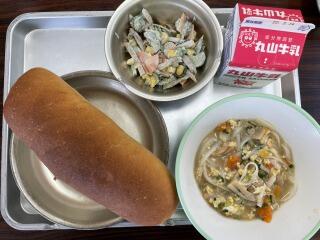 【減量コッペパン 牛乳 クイッティオスープ かみかみごぼうサラダ】